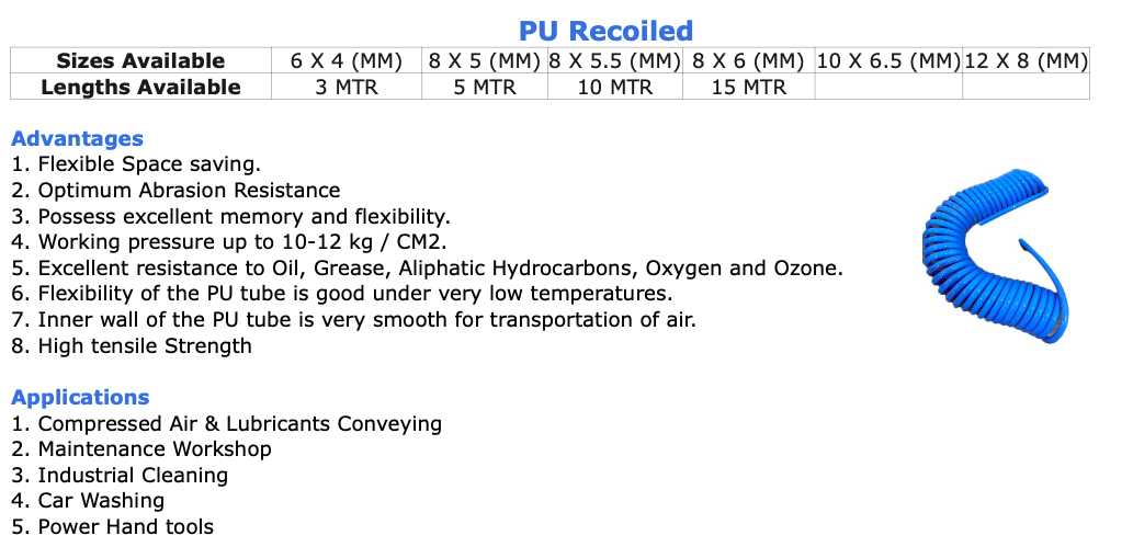 This polyurethane recoil tubing is ideal for installations needing versatility in limited spaces. It possesses excellent memory and flexibility.